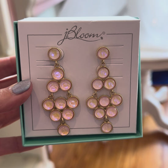 These eye-catching chandelier earrings feature graduated circles arranged in a graceful cascading pattern. Each blush pink circle is beautifully framed in gold, creating a luxurious bubble effect that's both whimsical and sophisticated.